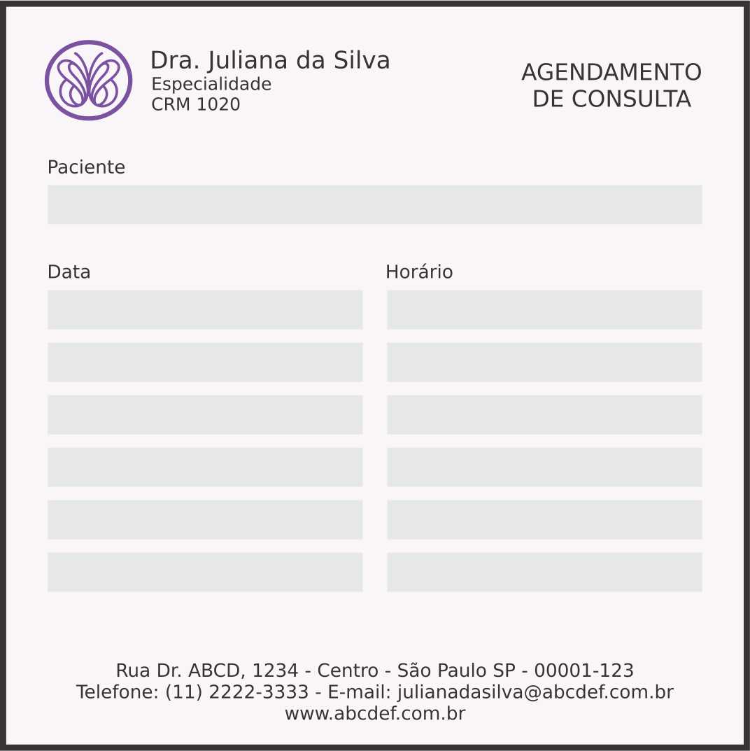 Com dimensões de 9x9cm, o tamanho deste bloco é ideal para que os pacientes guardem com facilidade, evitando perder as consultas marcadas. A arte do modelo apresenta uma faixa fina na cor lilás. A fonte manuscrita confere uma delicadeza que se harmoniza com o logotipo de borboleta, referente às glândulas da tireoide. Um pequeno desenho de borboleta adiciona um toque encantador. O fundo do bloco possui um suave tom de lilás claro, transmitindo uma sensação de tranquilidade.