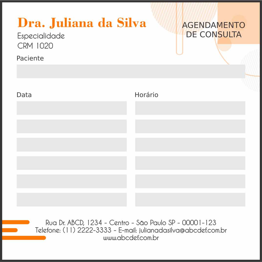 O Bloco de Agendamento de Consulta Clínica Geral Guizé é uma ferramenta essencial para a organização de sua clínica. Com formas geométricas irregulares que simbolizam os desafios do cotidiano, este modelo de arte destaca-se por seu layout em laranja intenso, refletindo a energia e vitalidade da prática clínica.