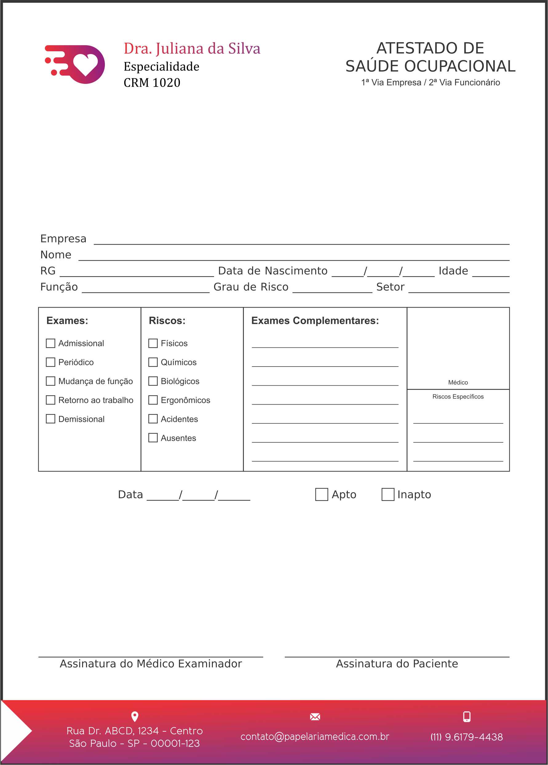 Bloco de ASO (Atestado de Saúde Ocupacional) em papel Autocopiativo com 50 folhas (25 atestados com 2vias);
