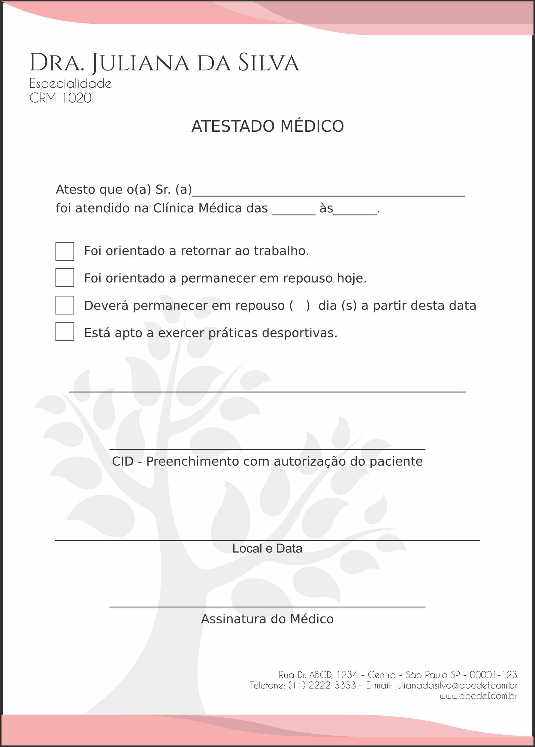A frente do atestado é impressa colorida, com um layout preenchido por formas geométricas em tons diferentes de rosa. Essas formas transmitem ternura e delicadeza, perfeitas para acompanhar os momentos especiais da sua jornada.