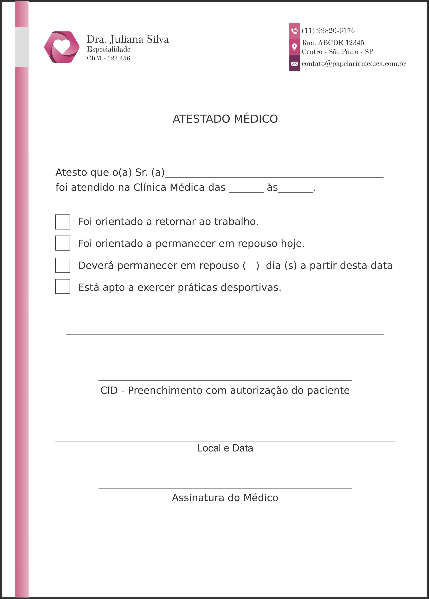 A frente do atestado é impressa em cores vibrantes, destacando-se pela sua arte limpa e sofisticada. Uma faixa delicada em tom rosa adiciona um toque de sutileza, complementando o design moderno e refinado do logotipo.