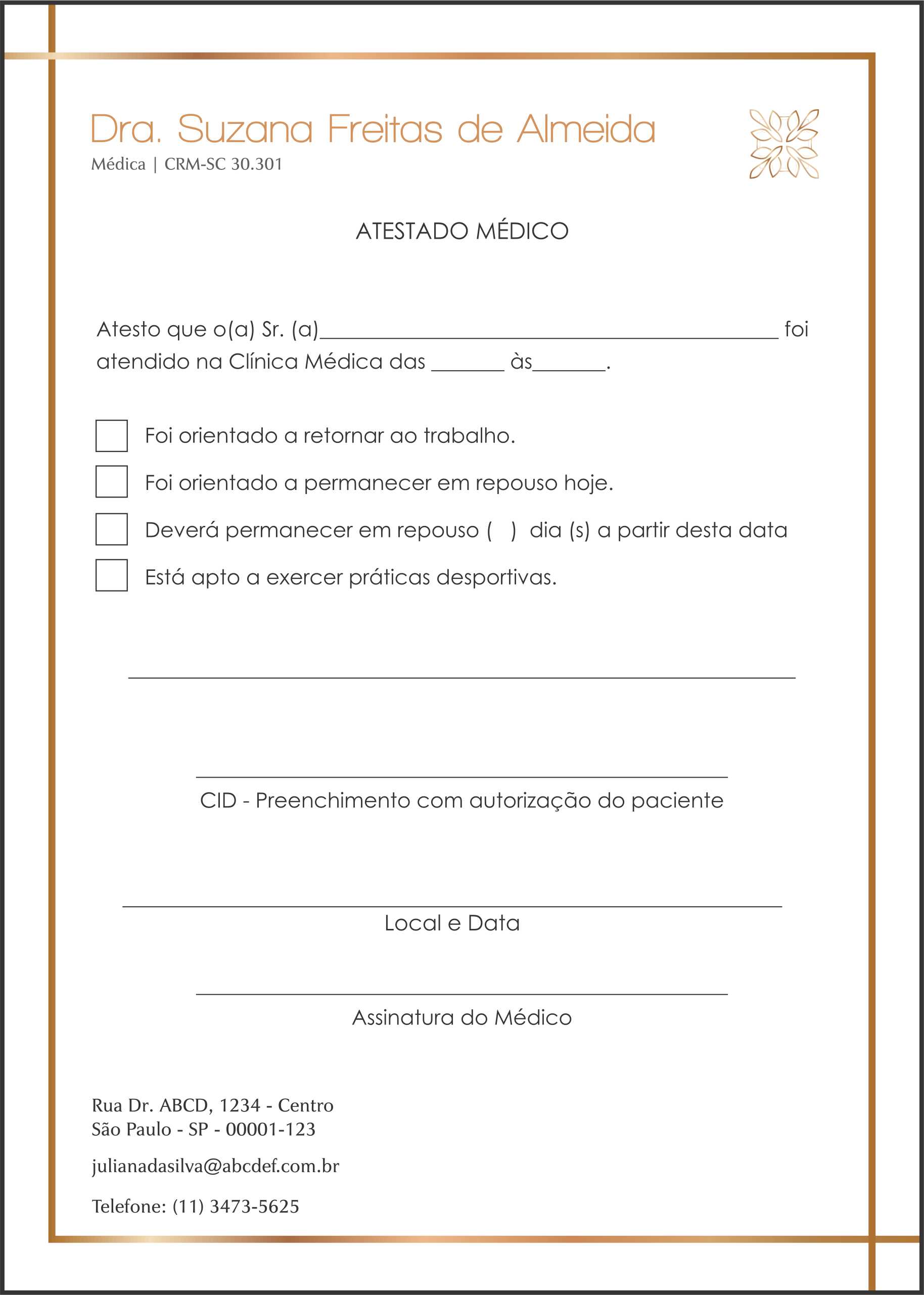 Este modelo exclusivo apresenta uma moldura marrom que envolve todo o layout, conferindo uma aura sofisticada. Além disso, uma delicada flor desenhada adiciona um toque de serenidade ao atestado.