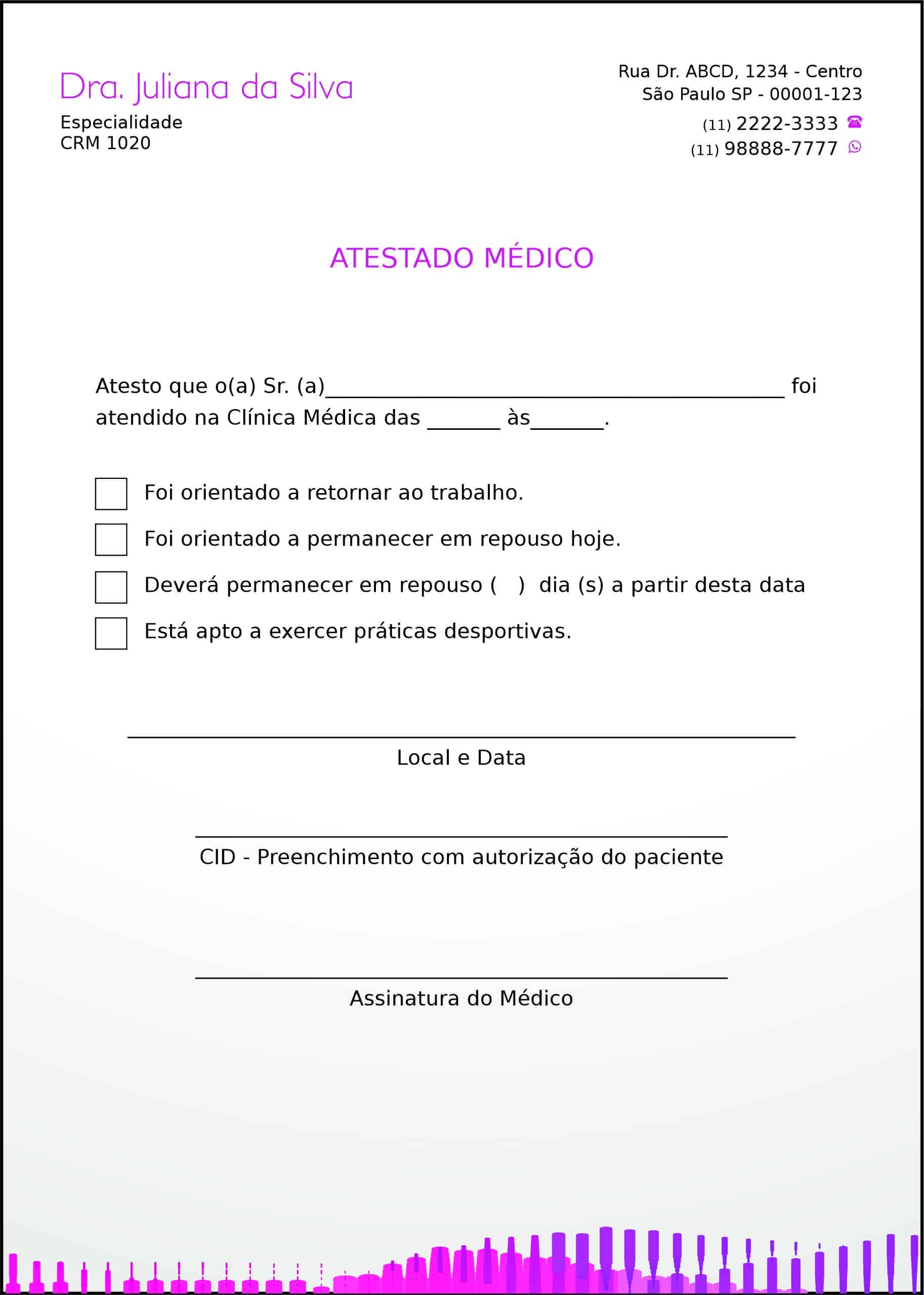 O Bloco de Atestado Ginecologia Austin foi criado para proporcionar um toque de profissionalismo e simplicidade ao seu consultório. Com um fundo branco e detalhes em tons de rosa, este modelo transmite uma sensação de organização e eficiência, ideal para atender suas pacientes com o máximo cuidado.