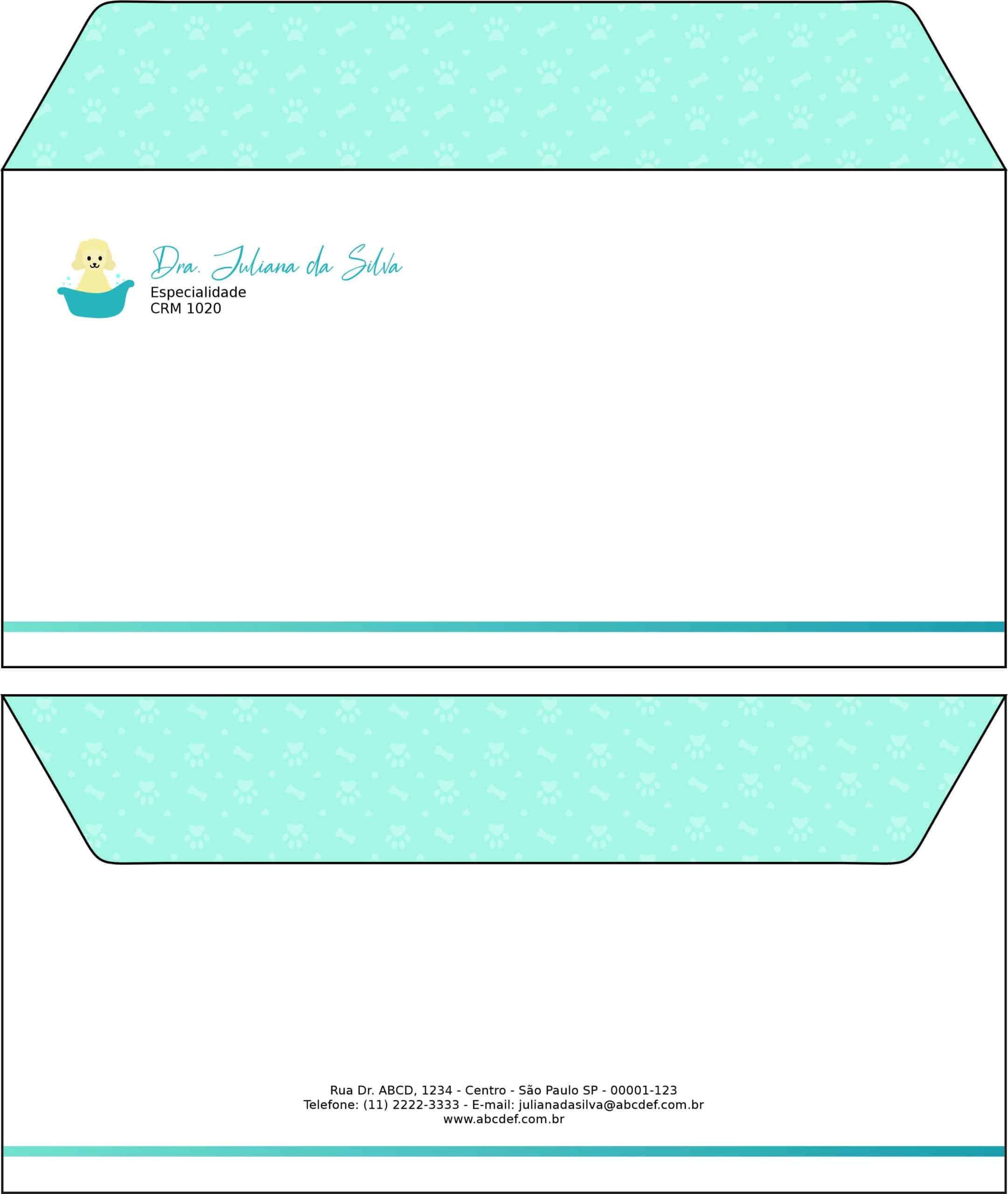 Nosso Envelope Ofício (Carta) Veterinário Enns apresenta um design clean e profissional, ideal para clínicas veterinárias e profissionais da saúde animal. Com um fundo de delicadas pegadas de animais, ele transmite cuidado e atenção aos pets, reforçando a confiança dos tutores.