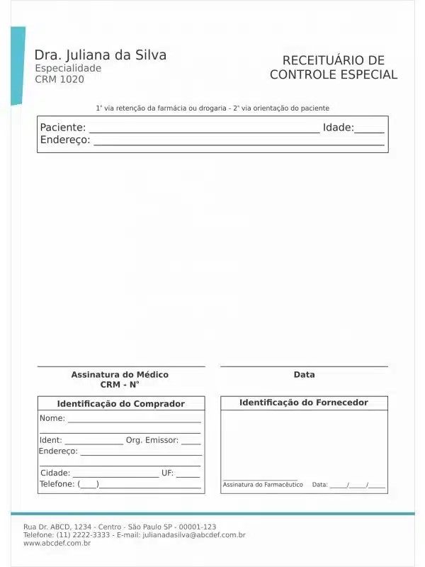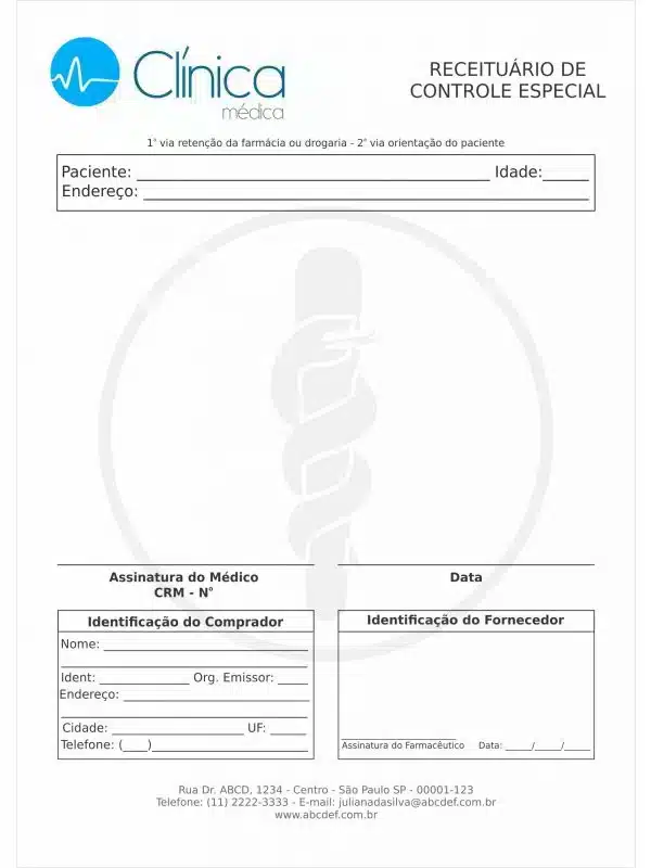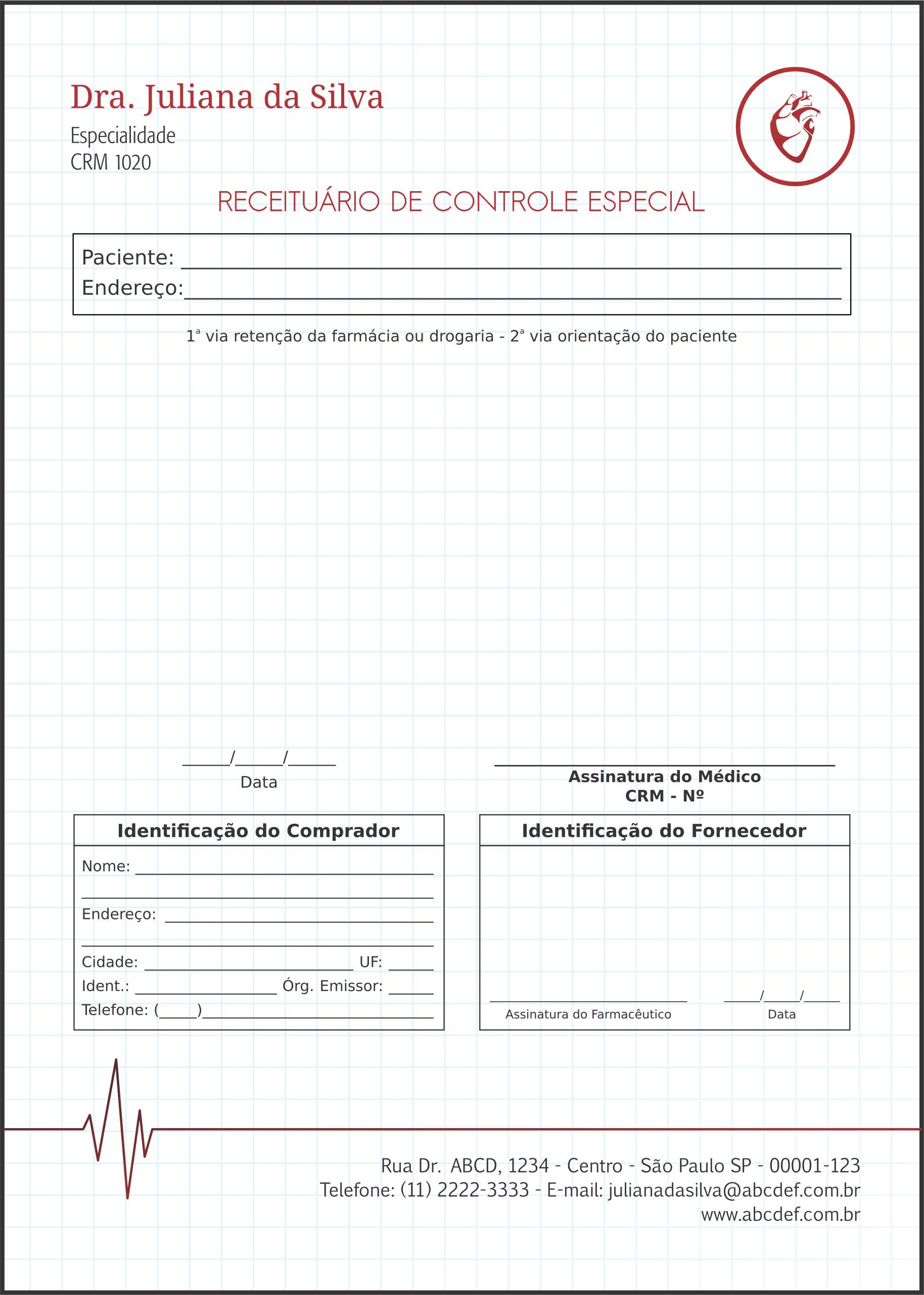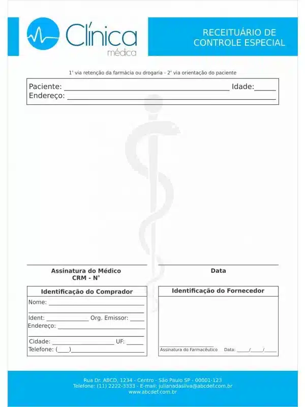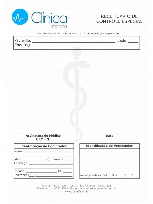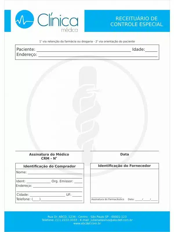 Receituário de Controle Especial; Tamanho padrão 15x21cm; Papel Autocopiativo; Bloco com 50 folhas sendo 25 receitas com 2 vias cada; Colorido frente.