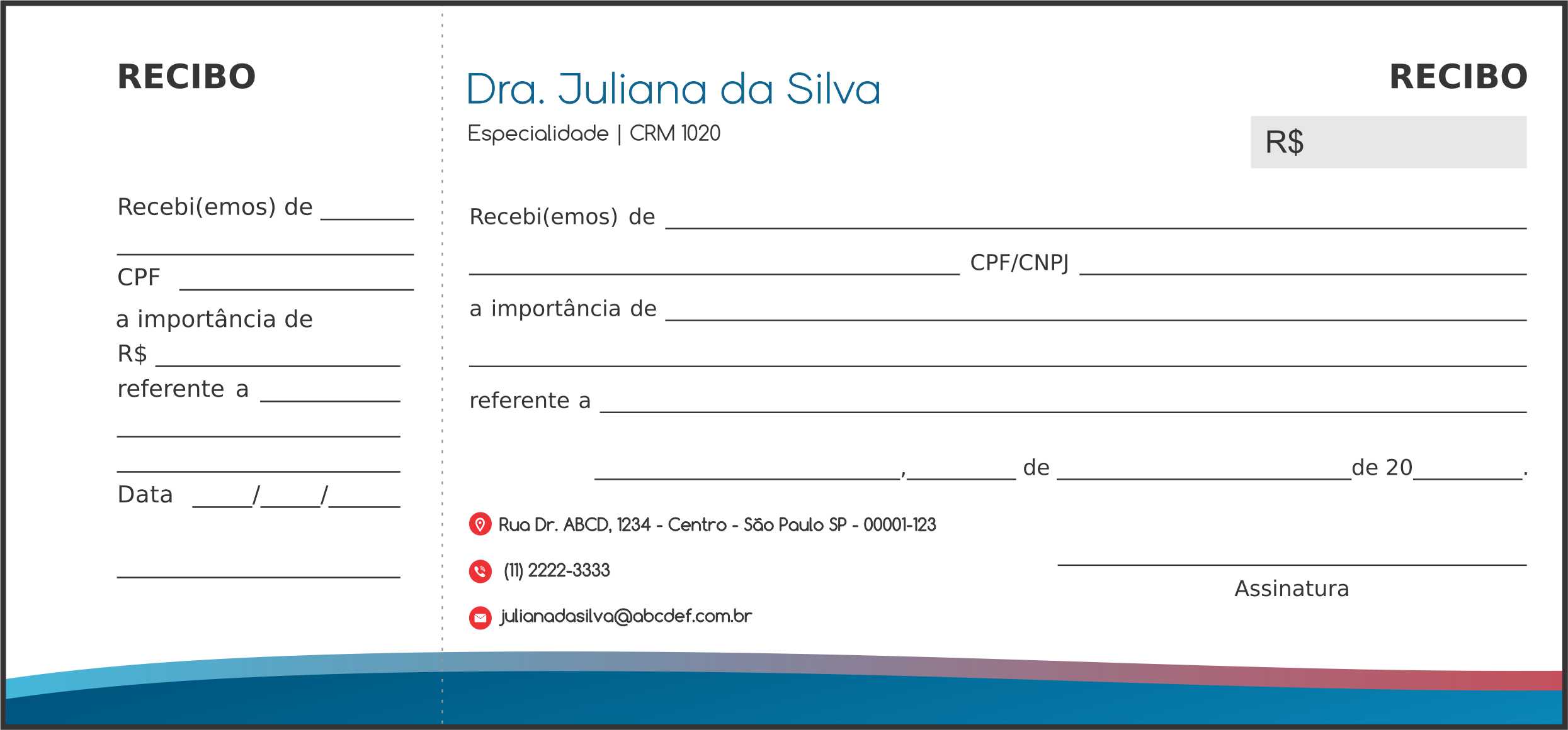 Com dimensões de 10x21cm, esses recibos são práticos e fáceis de manusear. O modelo apresenta uma onda suave criando uma sensação de tranquilidade. O logotipo de árvore em tons de azul e vermelho traz uma conexão visual com o sistema circulatório, reforçando sua especialidade em angiologia e vascular.