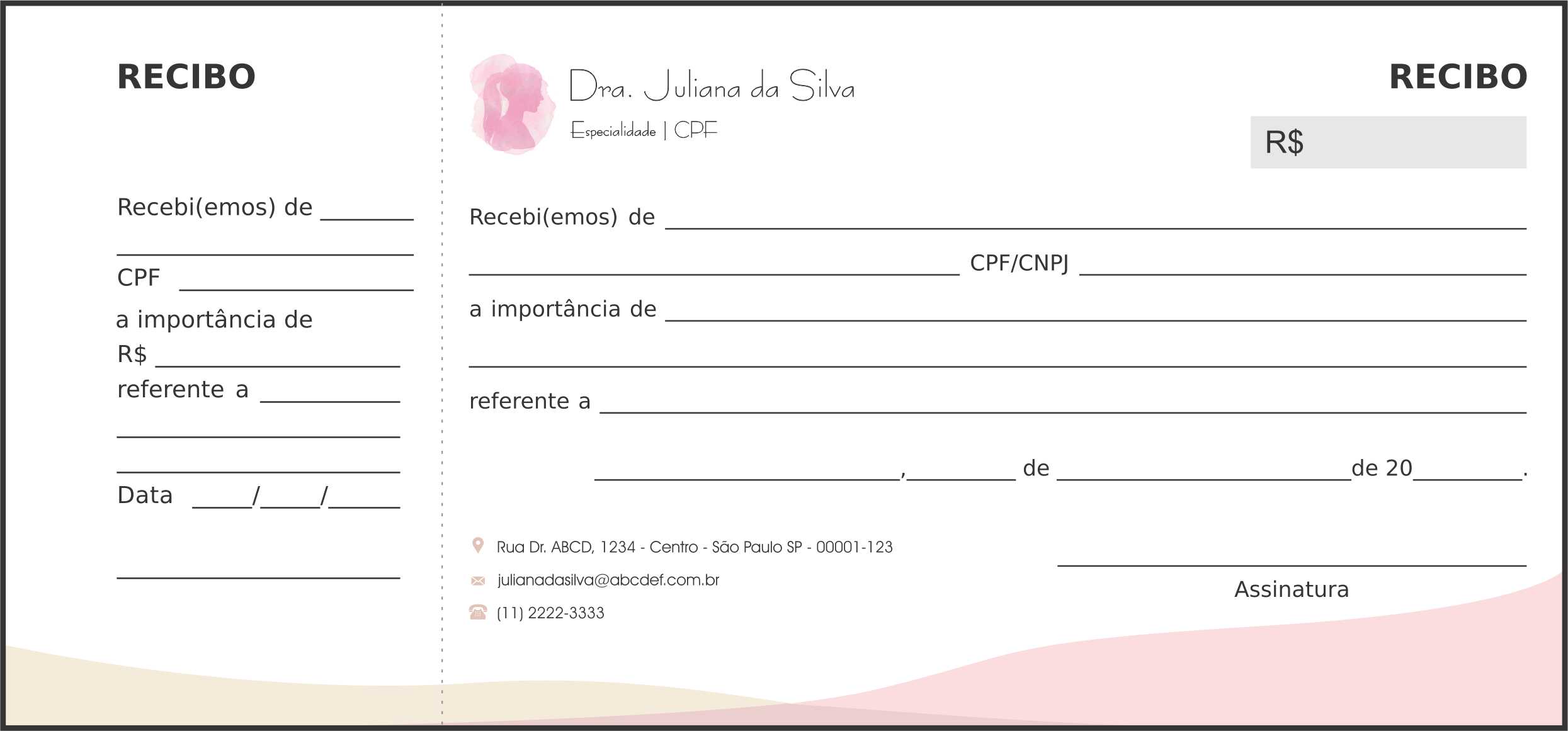 Na Papelaria Médica, entendemos a importância de um atendimento cuidadoso e profissional. Nosso Bloco de Recibo com Canhoto Dermatologista Bath é especialmente desenhado para refletir esses valores. A silhueta suave de uma mulher, em tons de amarelo e rosa, traz harmonia e delicadeza ao layout, enfatizando os cuidados com a beleza.