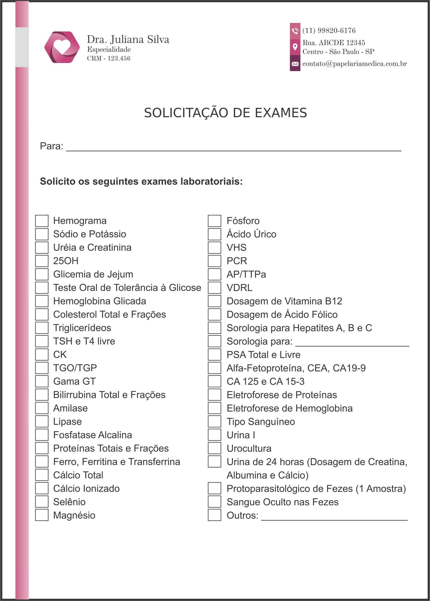 Acreditamos que a personalização é fundamental, por isso oferecemos a possibilidade de ajustar a arte sem custos adicionais. Assim, você pode ter certeza de que sua Solicitação de Exames reflete sua identidade profissional única.