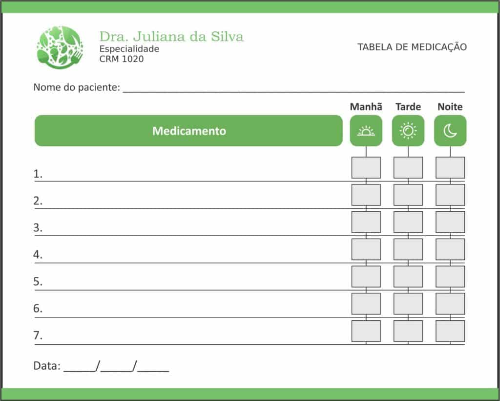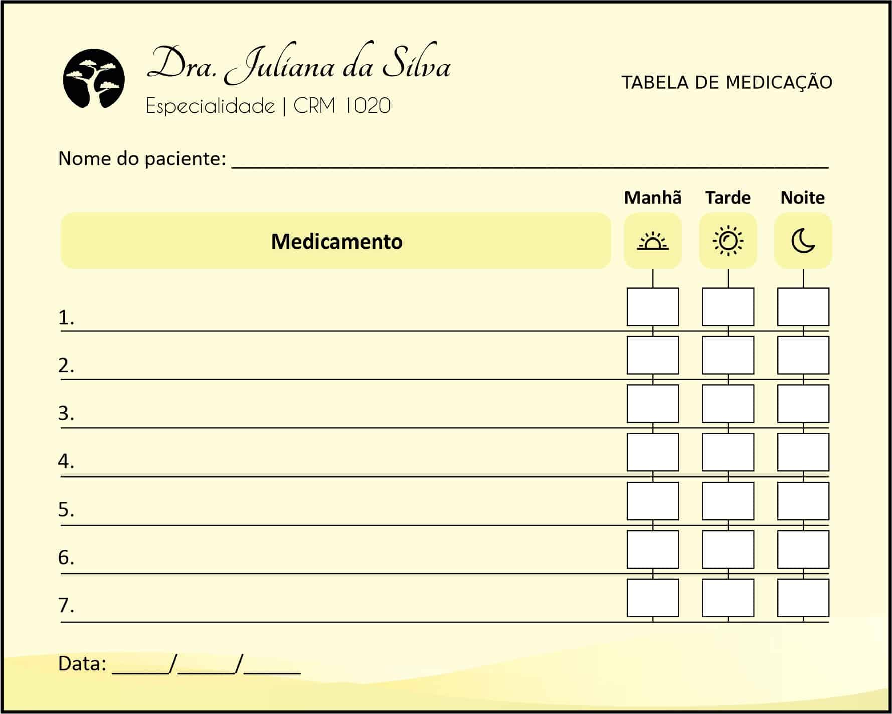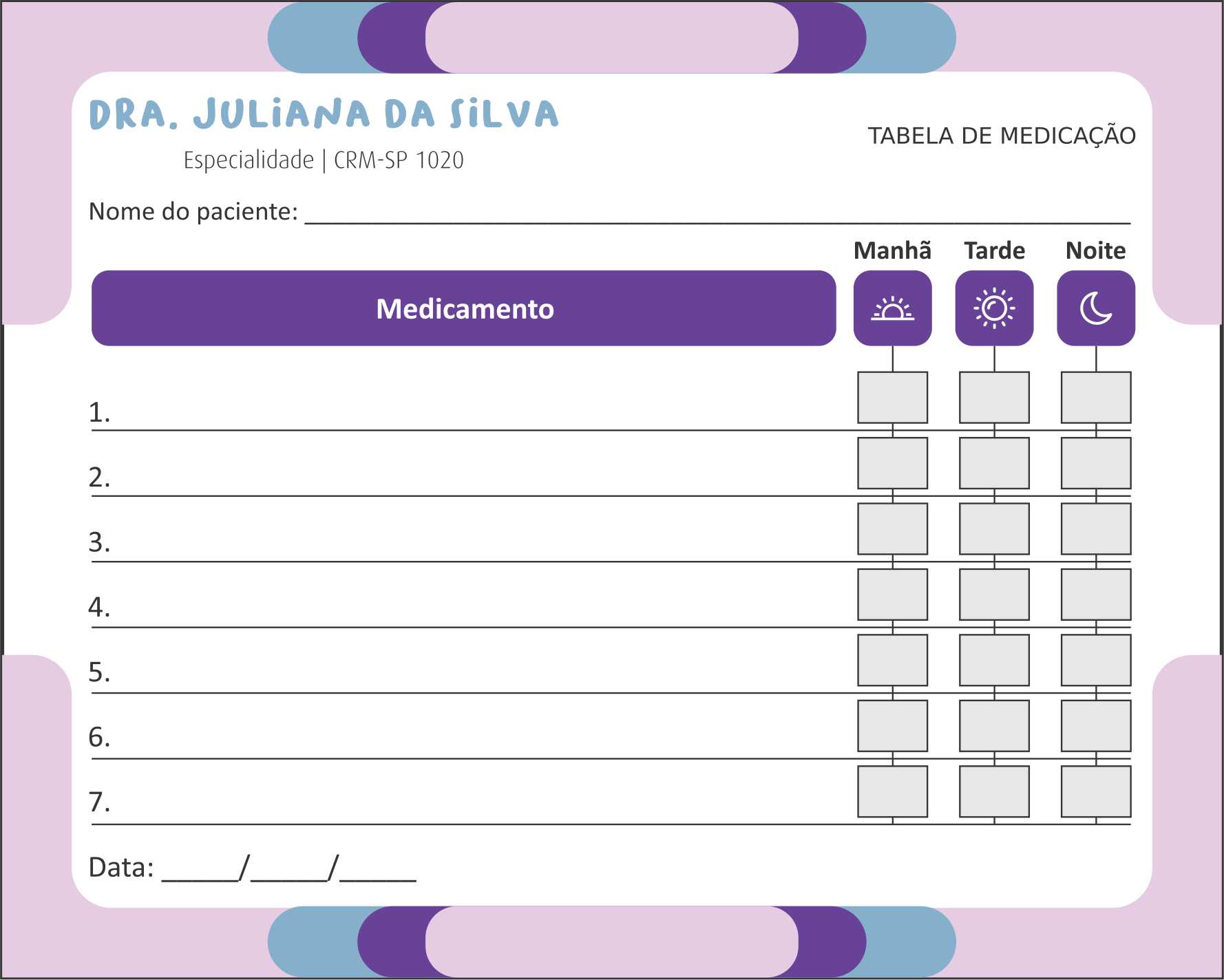 Auxilie seus pacientes a tomar suas medicações no horário correto com a Tabela de Medicação Geriatria Teerã. Essa tabela personalizada é perfeita para você, pois oferecemos a personalização da arte sem custos adicionais.