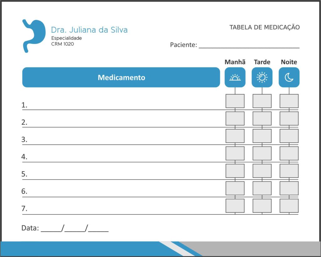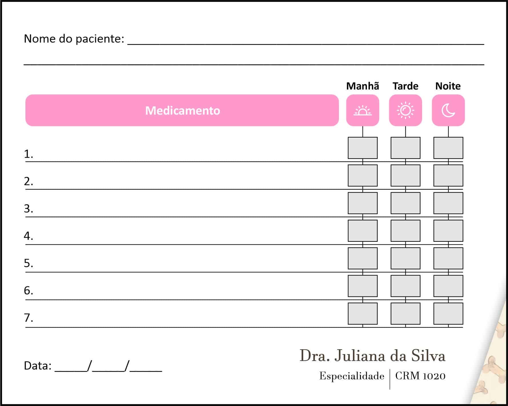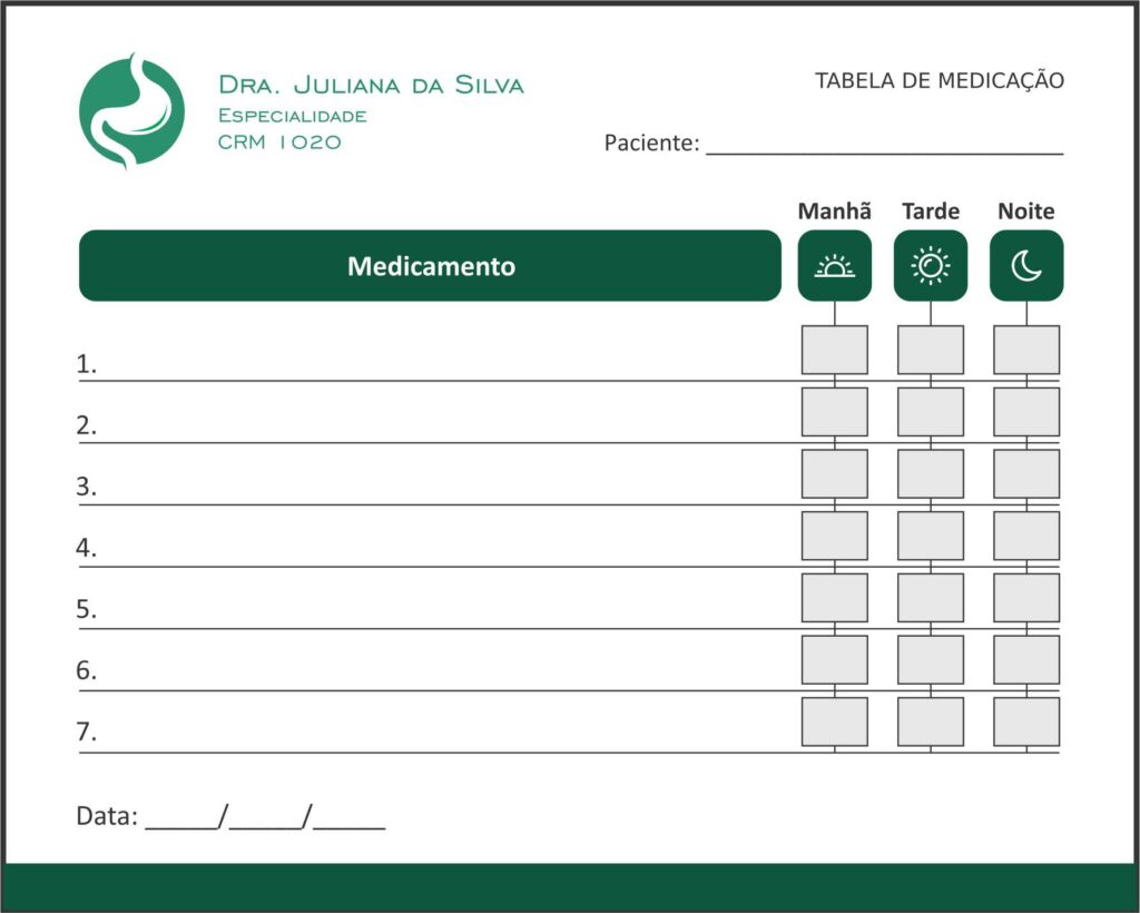 Nosso bloco de Tabela de Medicação Veterinário Baden apresenta um design clean e elegante, com um logotipo charmoso de pegadas e ossinhos. Este detalhe simboliza o cuidado e atenção dedicados aos animais de estimação.
